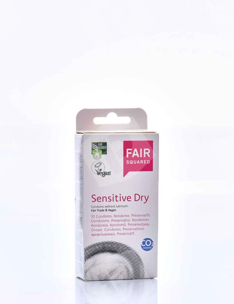 Prezerwatywy organiczne Sensitive Dry marki Fair Squared to produkty wegańskie wykonane z naturalnego lateksu pochodzącego z uczciwego handlu. Są pokryte cienką warstwą proszku kukurydzianego bez GMO. Nie są nawilżone i nie zawierają ani benzokaina, ani silikonu. Pudełko zawiera 10 prezerwatyw. Ten produkt jest idealny dla osób, które chcą mieć możliwość wyboru stosunku z lubrykantem lub bez.