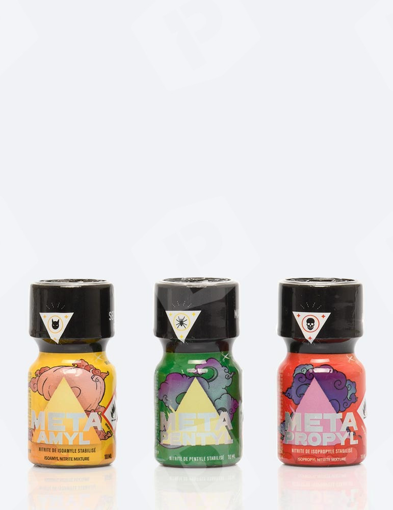 Pack Trio Meta 10 ml. Trzy poppers dla trzykrotnie mocniejszych wrażeń! Być może znasz gamę Meta? Poppers o tajemniczym designie, które kryją wiele skarbów: Meta Amyl, Meta Propyl, Meta Pentyl. Dzięki temu pakietowi możesz odkryć trzy azotyty dostępne w Euro Poppers Poland.