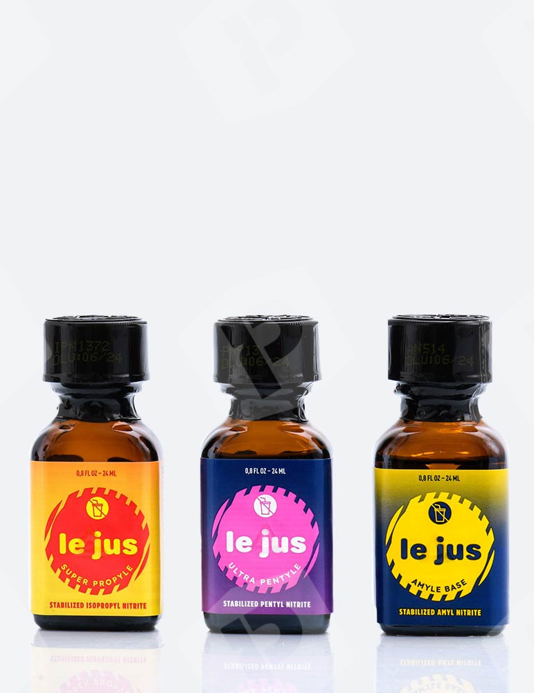 Trio Le Jus 24 ml. Chcesz odkryć całą gamę poppers Le Jus w dużym formacie (24 ml)? To ten zestaw poppers jest dla Ciebie! Nie musisz już wybierać, odkryj trzy poppers Le Jus z trzema azotanami: Super Propyle, Ultra Pentyle i Amyle Base. Odkryjesz w ten sposób poppers mniej lub bardziej mocne, ale o efektach euforyzujących i afrodyzjakalnych.